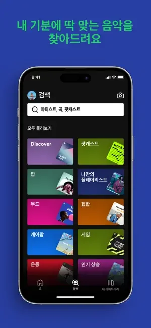 글로벌 음악 앱 Spotify로 전세계 수천만 곡의 노래를 감상하고, 나만을 위해 만들어진 플레이리스트부터 팟캐스트까지 즐겨보세요. 스트리밍부터 다운로드까지 가능한 다양한 요금제가 준비되어 있습니다.