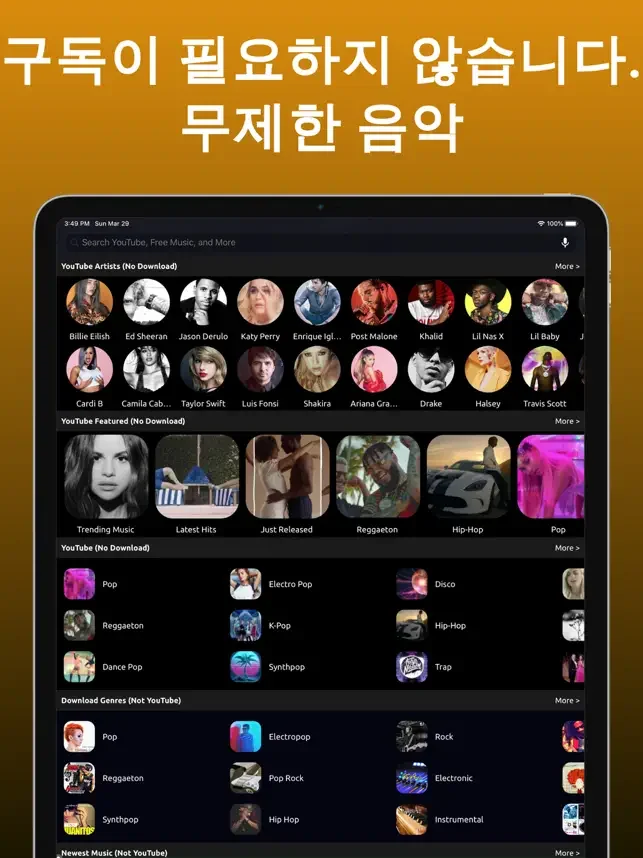 응용 프로그램은 비상업적 용도로만 스트리밍을 제공합니다. 모든 음악 콘텐츠는 합법적입니다. 참고: 이 앱은 YouTube 음악 다운로더가 아닙니다. YouTube 음악은 스트리밍할 수 있지만 다운로드할 수는 없습니다.