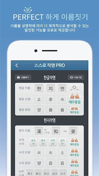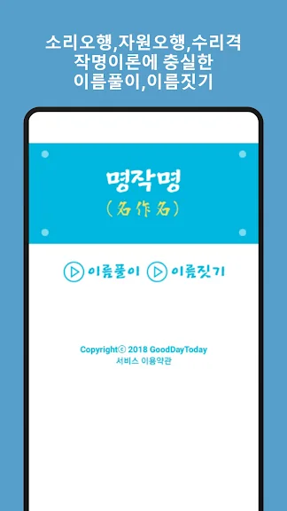 이 어플은 고전 학문인 성명학과 사주학의 원리를 이용해 사용자에게 가장 좋은 이름을 추천해 드리는 작명어플 입니다.