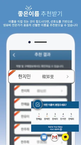 추천된 이름을 SNS나 메시지로 공유하면 가족과 지인들의 의견을 수렴하고 함께 고민할 수 있습니다.