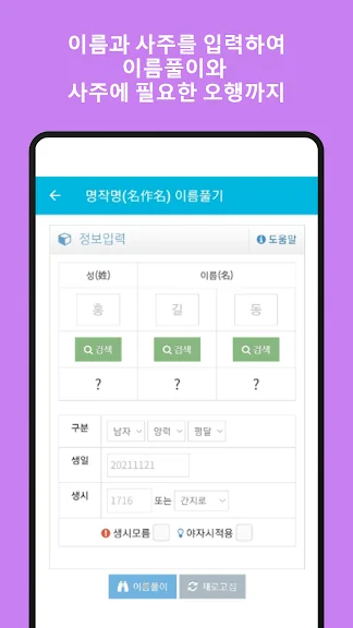 이름과 사주를 입력한후 이름풀이 진행하면 됩니다.