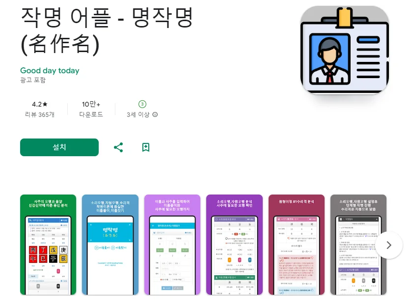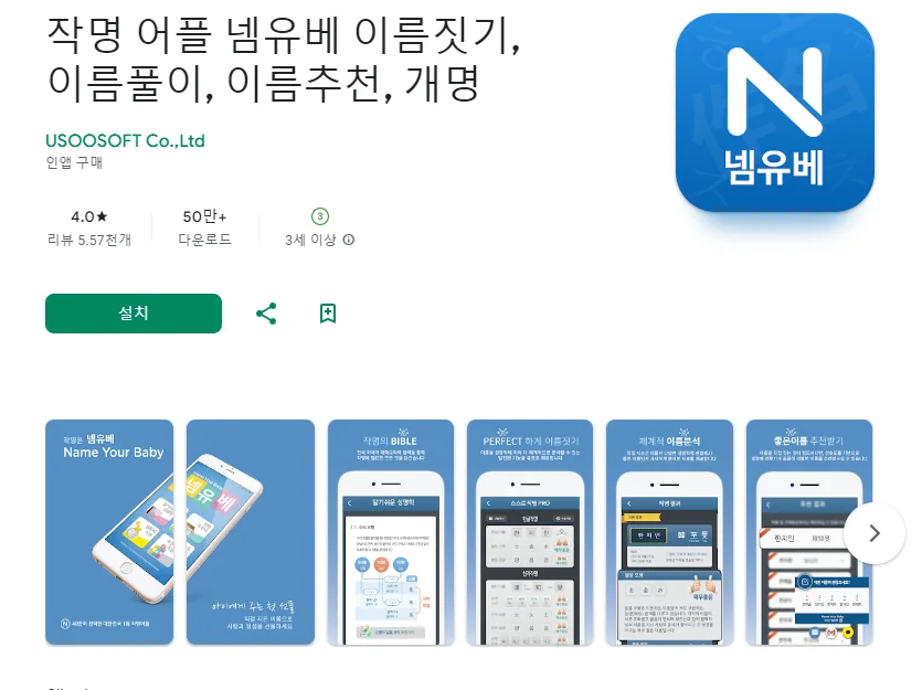 이 어플은 구글플레이스토어에서 "작명"로 검색했을때 3번째로 나오는 어플입니다. 아래는 작명 어플 네이머 작명, 이름짓기, 이름풀이, 개명 어플에 대한 자세한 설명이니 참고하세요.