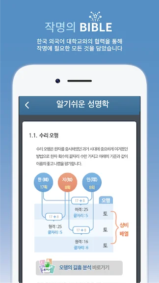 본 작명어플의 알기 쉬운 성명학은 누구라도 이해하기 쉽게 어려운 용어들을 배제하고 최소한의 Page로 구성하였으며 단 10분만 투자하신다면 여러분도 작명소에 가실 필요 없이 이름을 지으실 수 있는 토대를 마련하실 수 있습니다.