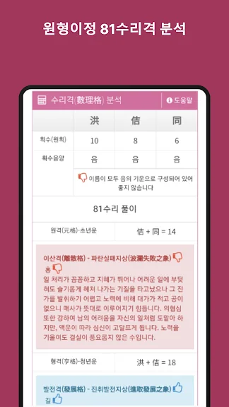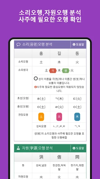 소리오행,자원오행,수리격에 맞게 지어진 이름인지 확인 할수 있습니다.
