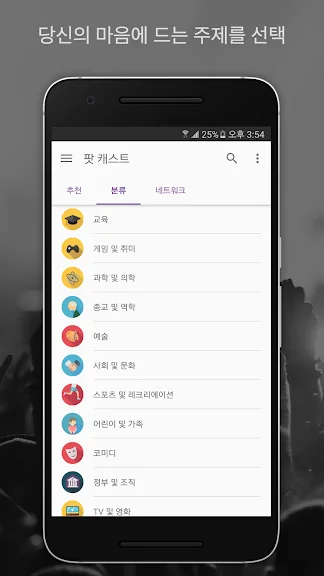 • 코미디, 뉴스, 역사, 음악, 비즈니스, TV 및 영화, 교육, 건강 및 피트니스, 기술, 예술, 과학, 스포츠 등 다양한 분야의 인기 팟캐스트를 찾아봅니다.