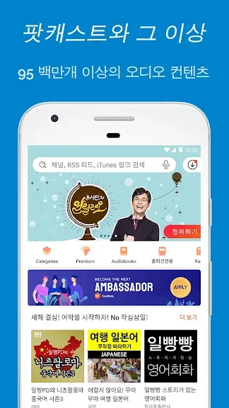 - 5천만개 이상의 팟캐스트, 라디오채널, 오디오북 등 16개의 다양한 카테고리로 분류 되어 있습니다. 언제든지 새롭고 인기있는 팟캐스트를 찾을수 있습니다. 선호하시는 팟캐스트는 한국어를 포함한 다른 70가지의 언어로 검색 또는 청취할 수 있습니다. 다국어 언어강의 팟캐스트도 함께 즐겨보세요!
