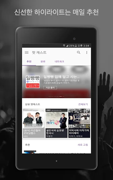 - 귀하의 청취 기록과 구독 채널을 통해 개인의 취향에 맞는 팟캐스트를 추천합니다.