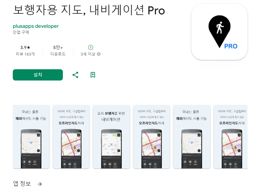 이 어플은 구글플레이스토어에서 "도보 길찾기"로 검색했을때 4번째로 나오는 어플입니다. 아래는 보행자용 지도, 내비게이션 Pro 어플에 대한 자세한 설명이니 참고하세요.