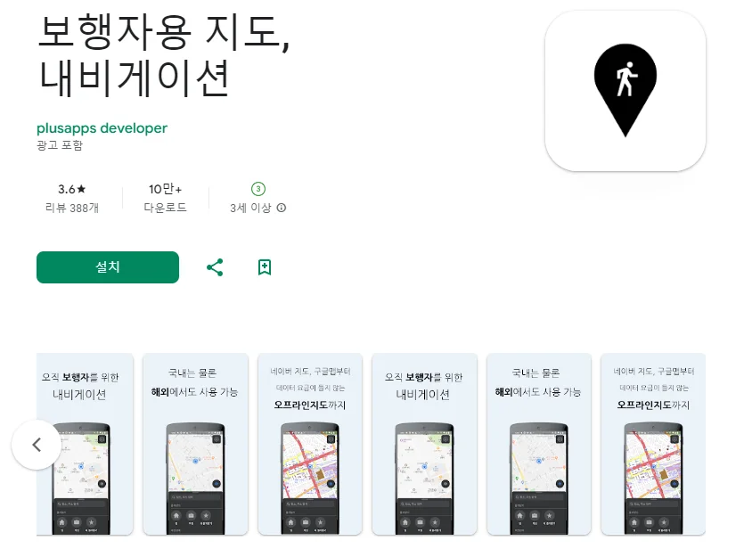이 어플은 구글플레이스토어에서 "도보 길찾기"로 검색했을때 1번째로 나오는 어플입니다. 아래는 보행자용 지도, 내비게이션 어플에 대한 자세한 설명이니 참고하세요.