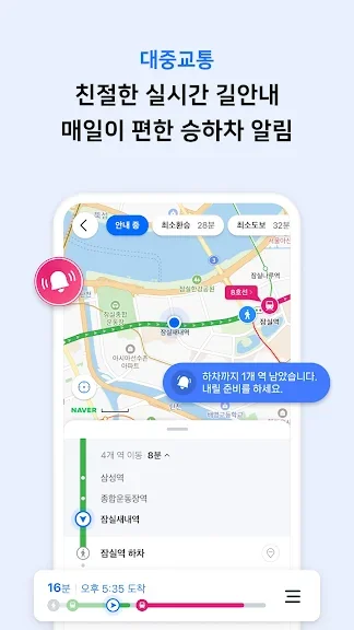 다양한 대중교통 길찾기 결과를 확인하고, 실시간 도착정보와 승하차 안내 기능으로 쉽고 편리하게 목적지까지 갈 수 있어요.