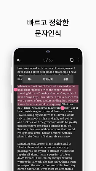 문자 인식 기능을 통해 스캔 한 이미지를 텍스트로 변환할 수 있습니다. 변환한 텍스트를 복사하여 친구나 동료에게 간편하게 공유할 수 있습니다.