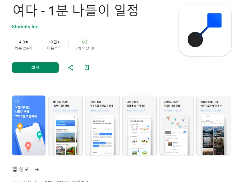 이 어플은 구글플레이스토어에서 "국내 여행 계획"로 검색했을때 1번째로 나오는 어플입니다. 아래는 여다 - 1분 나들이 일정 어플에 대한 자세한 설명이니 참고하세요.