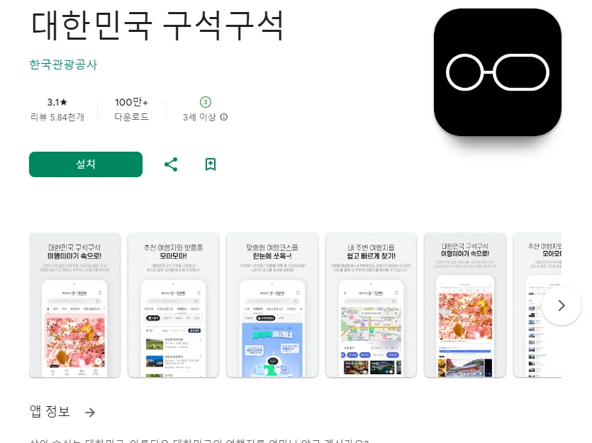 이 어플은 구글플레이스토어에서 "국내 여행 계획"로 검색했을때 3번째로 나오는 어플입니다. 아래는 대한민국 구석구석 어플에 대한 자세한 설명이니 참고하세요.