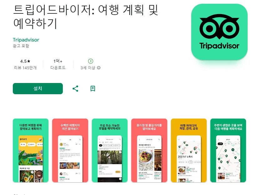 이 어플은 구글플레이스토어에서 "국내 여행 계획"로 검색했을때 4번째로 나오는 어플입니다. 아래는 트립어드바이저: 여행 계획 및 예약하기 어플에 대한 자세한 설명이니 참고하세요.