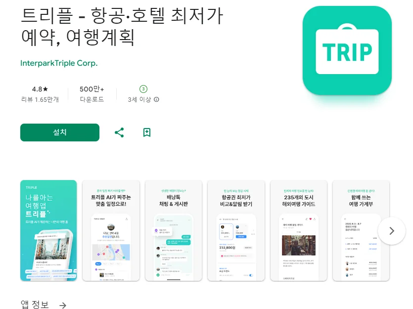 이 어플은 구글플레이스토어에서 "국내 여행 계획"로 검색했을때 2번째로 나오는 어플입니다. 아래는 트리플 - 항공·호텔 최저가 예약, 여행계획 어플에 대한 자세한 설명이니 참고하세요.