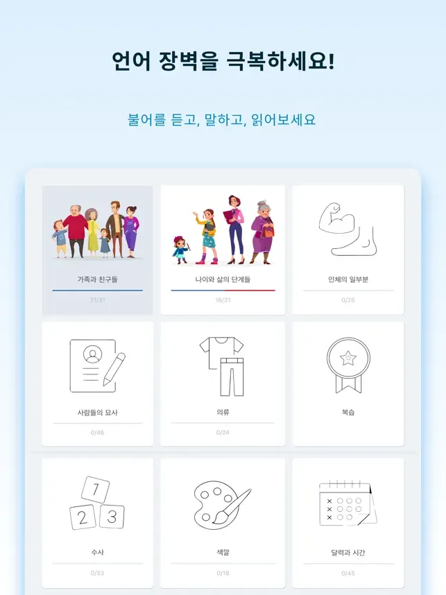 기본 : 알파벳 글자, 숫자, 색상, 동사, 음식…