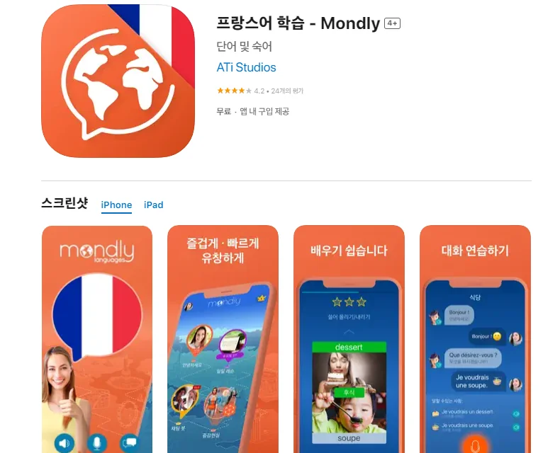 아래는 아이폰 프랑스어 학습 - Mondly 어플에 대한 자세한 설명입니다. 참고하세요.