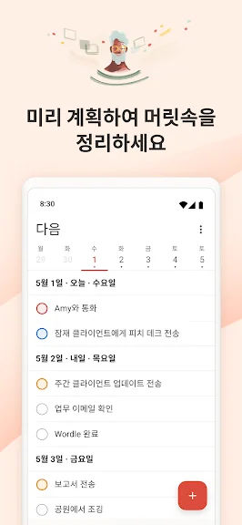 단순히 탭하여 작업을 추가하고 미리 알림을 설정하며, 캘린더, 목록, 보드와 같은 다양한 보기와 함께, 직장 및/또는 개인 업무별로 작업을 필터링하고, 프로젝트에서 공동 작업하며, 마음의 평온를 얻으세요.