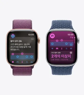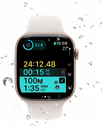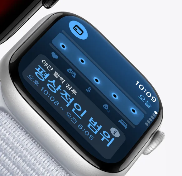 애플 워치 10은 3세대 심박수 및 심전도 센서, 혈중 산소포화도 센서, 체온 센서 등 다양한 건강 모니터링 센서가 탑재되어 있습니다. 새롭게 추가된 수온 센서를 통해 수영 시 수온을 측정할 수 있으며, 체온 센서는 사용자 체온 변화를 파악해 생리 주기와 배란일 예측을 도와줍니다. 또한, 수면 무호흡증 감지 기능이 주기적으로 사용자의 호흡 상태를 확인해 이상이 발견되면 알림을 제공하여 건강 관리에 유용합니다.
