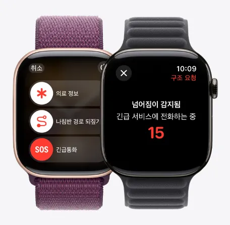 애플 워치 10은 watchOS 11을 기반으로 다양한 스마트 기능을 갖추고 있습니다. 음성 분리 기능은 4코어 Neural Engine을 활용해 통화 중 주변 소음을 억제해주어 더욱 깨끗한 통화 품질을 제공합니다. 자체 스피커를 통해 음악 재생도 가능하며, 새로운 더블 탭 기능으로 엄지와 검지를 가볍게 터치하는 동작만으로 시계를 손쉽게 제어할 수 있습니다. 최대 256G 중력의 충격을 감지하는 충돌 감지 기능도 탑재되어 있어 긴급 상황 발생 시 자동으로 구조 전화를 발신하는 안전성을 강화했습니다.