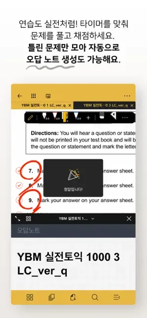 스콘은 단순히 보는 것에 그치지 않습니다. 문제풀이 기능을 통해 정답을 입력하고 자동 채점을 경험해 보세요. 타이머 기능으로 실전 같은 환경을 조성하고, 오답 노트 자동 생성으로 학습 효과를 극대화하세요.