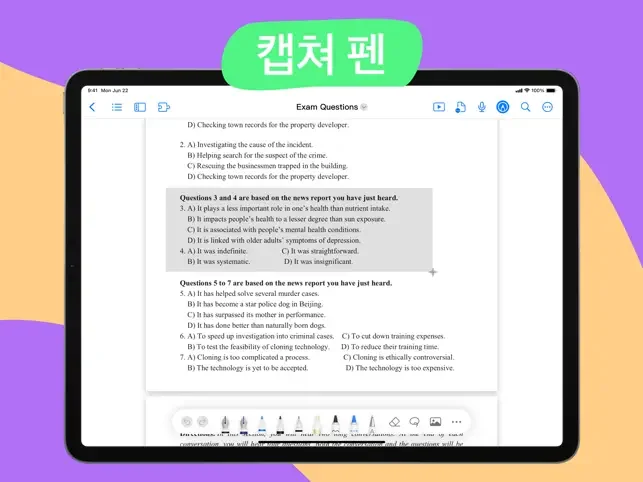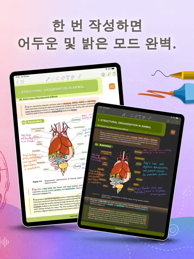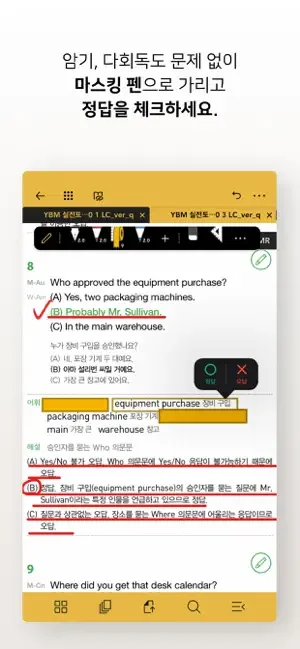 펜 제스처 기능은 학습 시간을 단축시키는 강력한 도구입니다. 단어 선택 후 클릭만으로 검색, 북마크, 사전 활용 등 다양한 작업이 가능하며, 하이라이트와 밑줄로 필기를 풍부하게 꾸밀 수 있습니다. 또한, 다채로운 색상과 편집 옵션으로 개성을 더한 필기를 지원합니다.