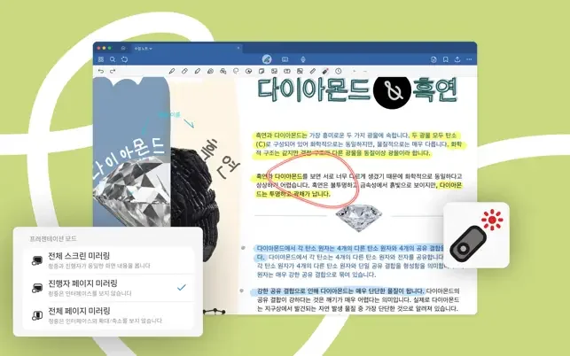 전문가와 플래너를 위한 생산성 도구도 빼놓을 수 없습니다. AirPlay와 HDMI를 통해 노트를 외부 화면에 표시하거나, iPad에서 레이저 포인터 기능으로 프레젠테이션을 효과적으로 진행할 수 있습니다. PDF 형식으로 노트를 공유하거나, 동료와 실시간 협업도 가능합니다.