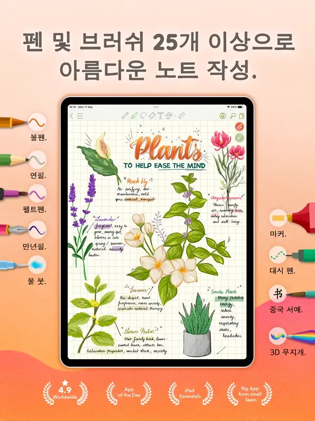 Apple Pencil 사용자라면 더욱 특별한 경험이 기다립니다. 25가지 이상의 펜과 브러시로 창의력을 펼치고, 필기 안정화 기능으로 매끄러운 글쓰기를 즐길 수 있습니다. 무한 Arc 메뉴를 통해 작업 흐름을 간소화하고, 편안한 ASMR 필기의 매력을 느껴보세요.