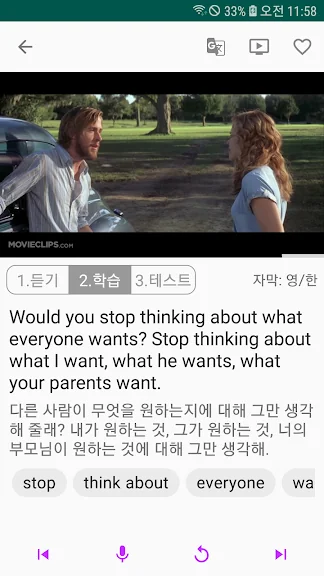 한 구절씩 영상을 반복해서 듣고 쉐도잉 연습을 할 수 있습니다. 쉐도잉 연습을 할 때는 앱에서 제공하는 녹음 기능을 이용하여 자신의 발음을 듣고 체크할 수 있습니다.