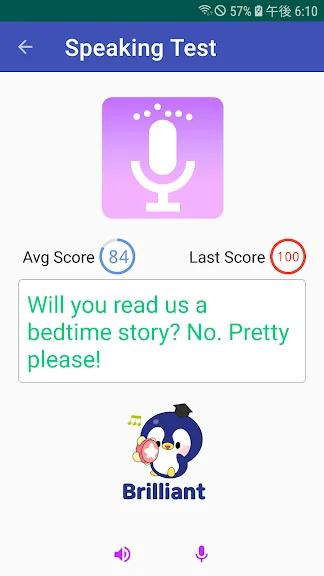 사용자가 문장을 말하면, AI가 발음을 평가하여 결과를 표시해주는 기능이 있어서, 재미있게 스피킹 연습을 하실 수 있습니다.
