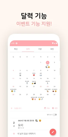앱을 실행하면 원하는 형식으로 손쉽게 기록을 남길 수 있습니다. 기분을 선택하고, 사진을 첨부하고, 손글씨 폰트로 감성을 더하는 등 다양한 기능이 제공됩니다. 또한, 알람 설정을 통해 하루의 소중한 순간을 놓치지 않고 기록할 수 있습니다.