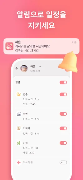 6) **일과 리마인더 기능** – 약 복용, 수유, 수면 등의 일정을 미리 설정하여 중요한 일정을 놓치지 않도록 도와줍니다.