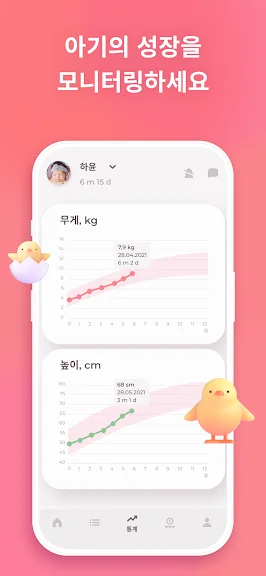 5) **건강 및 성장 추적** – 체온, 백신 접종, 보충식 반응 등을 기록하고, 체중 및 성장 상태를 체크할 수 있습니다.