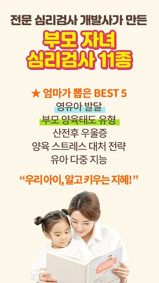 부모와 자녀를 위한 11종의 심리 검사는 더욱 특별한 장점 중 하나입니다. 영유아 발달 검사부터 양육 태도 및 유형 검사까지, 부모로서의 방향을 찾을 수 있도록 도와줍니다. 전문 심리검사 개발사의 노하우가 담긴 검사를 통해 아이를 더욱 이해하고 현명하게 양육할 수 있습니다.