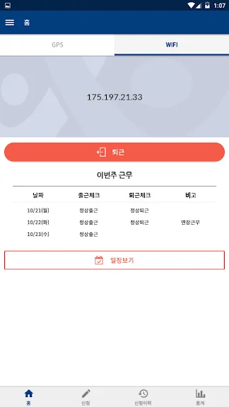 아래는 근태관리 어플에 대한 스크린샷 정보입니다.