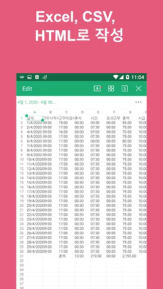 아래는 타임시트 - 타임카드 - 근무시간 - 근무일지 어플에 대한 스크린샷 정보입니다.