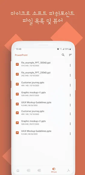 '모든 문서 리더'를 사용해 보세요! 이 올인원 파일 뷰어는 모든 Office 파일과 호환되며, PDF, DOC, DOCX, XLS, XLXS, PPT, TXT 등 모든 형식의 파일을 간편하게 처리할 수 있습니다. 휴대폰에 있는 파일을 자동으로 스캔하고, 한 곳의 해당 폴더에 정리함으로써 편리하게 검색하고 열람할 수 있습니다.