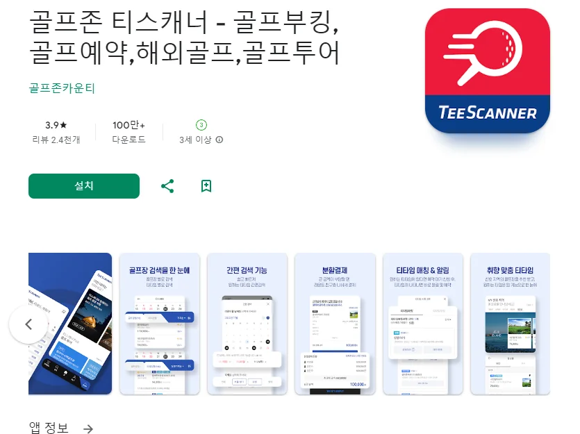 이 어플은 구글플레이스토어에서 "골프장 예약"로 검색했을때 1번째로 나오는 어플입니다. 아래는 골프존 티스캐너 - 골프부킹,골프예약,해외골프,골프투어 어플에 대한 자세한 설명이니 참고하세요.