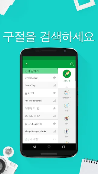 독일어 공부 앱으로, 완전하게 순수한 재미를 즐기면서 짧은 일상 대화를 위한 5,000개 이상의 독일어 구문을 들어 보실 수 있습니다! 독일어 국가에서 휴가를 즐기는 여행객이거나 외국어로 말하는 것을 좋아하는 분이시라면, 이 앱으로 빠르고, 쉽게, 즐거운 방법으로 독일어 구문을 공부 수 있습니다.