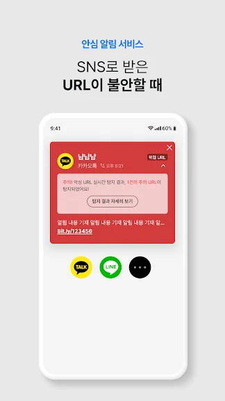 • 문자 메시지를 검사해 악성, 피싱, 스팸 메시지인지 알려드려요.