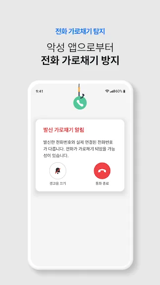 보이스피싱 및 해킹의 위험이 있는 악성 앱이 설치 및 탐지될 시 알림을 제공하며 제휴된 금융사에서 보이스피싱을 차단하도록 합니다.