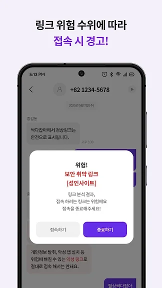보이스피싱 및 해킹으로 이어질 수 있는 악성 IP/URL이 포함된 메시지, 가족과 지인을 사칭하는 메시지 등 보이스피싱에 활용되는 문자를 탐지하여 알림 제공합니다.