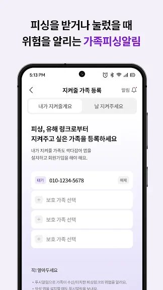 - 내가 보호받기: 내가 피싱 의심 번호와 통화할 경우 가족이 알림을 받아 보호받을 수 있습니다.