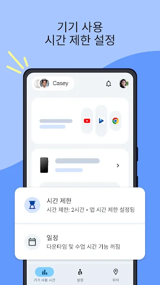 • 기기 사용 시간 제한 설정: 자녀에게 가장 적절한 기기 사용 시간을 찾아보세요. Family Link를 사용하면 자녀의 기기에 수업 시간 및 다운타임 일정을 포함한 일일 시간 한도를 설정할 수 있으므로 자녀가 균형 잡힌 기기 사용 습관을 들이도록 도울 수 있습니다.