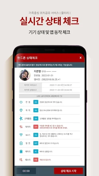 ⑦ 위치추적 이외에 다양한 기기의 상태 체크 (배터리, 벨소리, WIFI, 위치 장치 등)를 통해 자녀 스마트폰 관리 및 자녀보호기능 수행