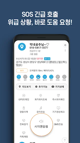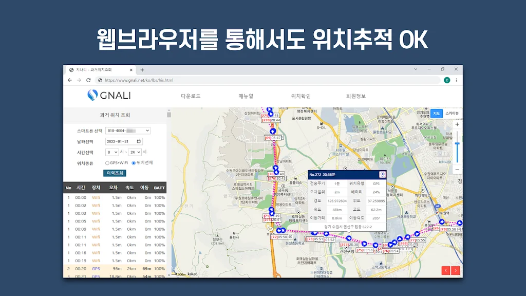 실시간으로 이동하는 상황을 조회할 수 있으며 데이터가 꺼져 있을 때도 SMS를 이용해 현재 위치를 확인할 수 있습니다.