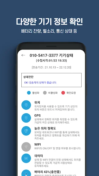 이동 경로를 기록하여 지도상에서 이동 방향과 상세 이동 경로를 조회할 수 있으며 언제 어느 위치에서 얼마나 체류하였는지 활동 정보를 요약해서 표시해 줍니다.