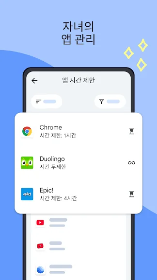 • 자녀의 앱 관리: 앱 사용과 관련하여 자녀에게 필요한 유연성을 제공합니다. 개별 앱에 사용 시간 제한을 설정하고 교육용 앱이나 정기적으로 사용하는 앱은 시간을 무제한으로 설정할 수 있습니다. 앱 차단도 가능합니다.