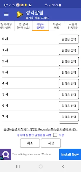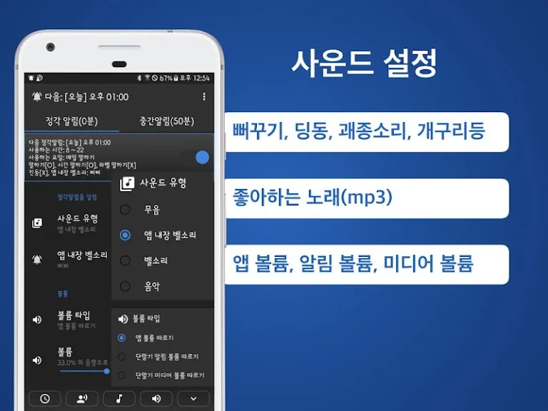 - 정각알림음 대신 시간별 사용자 설정 알림음 사용