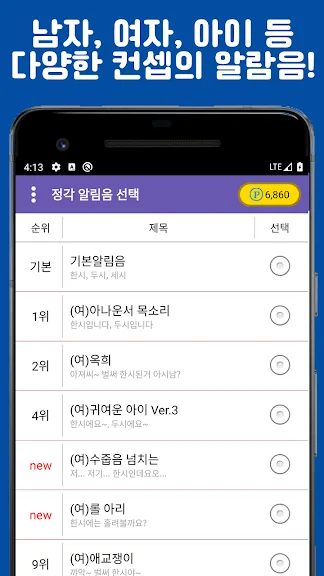 *남,여,테마별로 다양한 알람음을 만나실 수 있습니다.